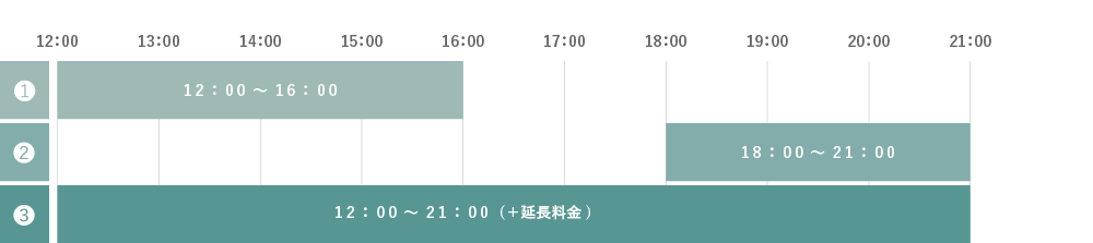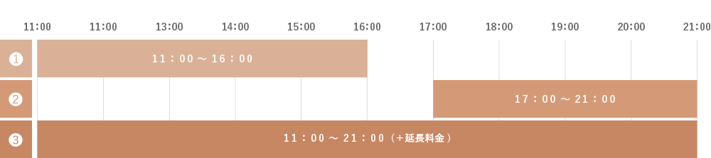 昼(11:00〜16:00)と夜(17:00〜21:00)の2部制です。昼から夜までのご利用も可能です